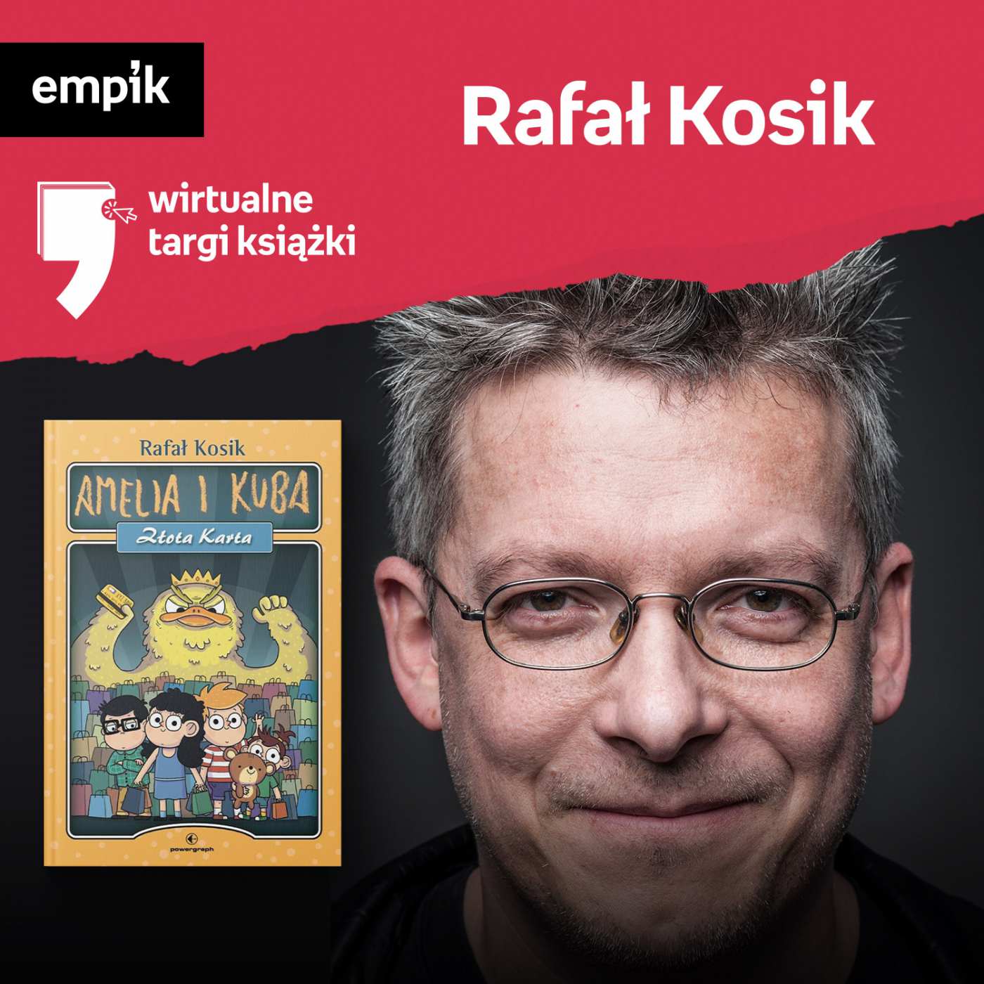 W #8 odcinku serii Wirtualne Targi Książki zapraszamy do wysłuchania nagrania z premiery książki Rafała Kosika „Amelia i Kuba. Złota karta” (Wydawnictwo Powergraph). Rozmowę poprowadziła Justyna Dżbik. Wydarzenie było transmitowane live na Facebooku Empik 23 maja 2020 roku.