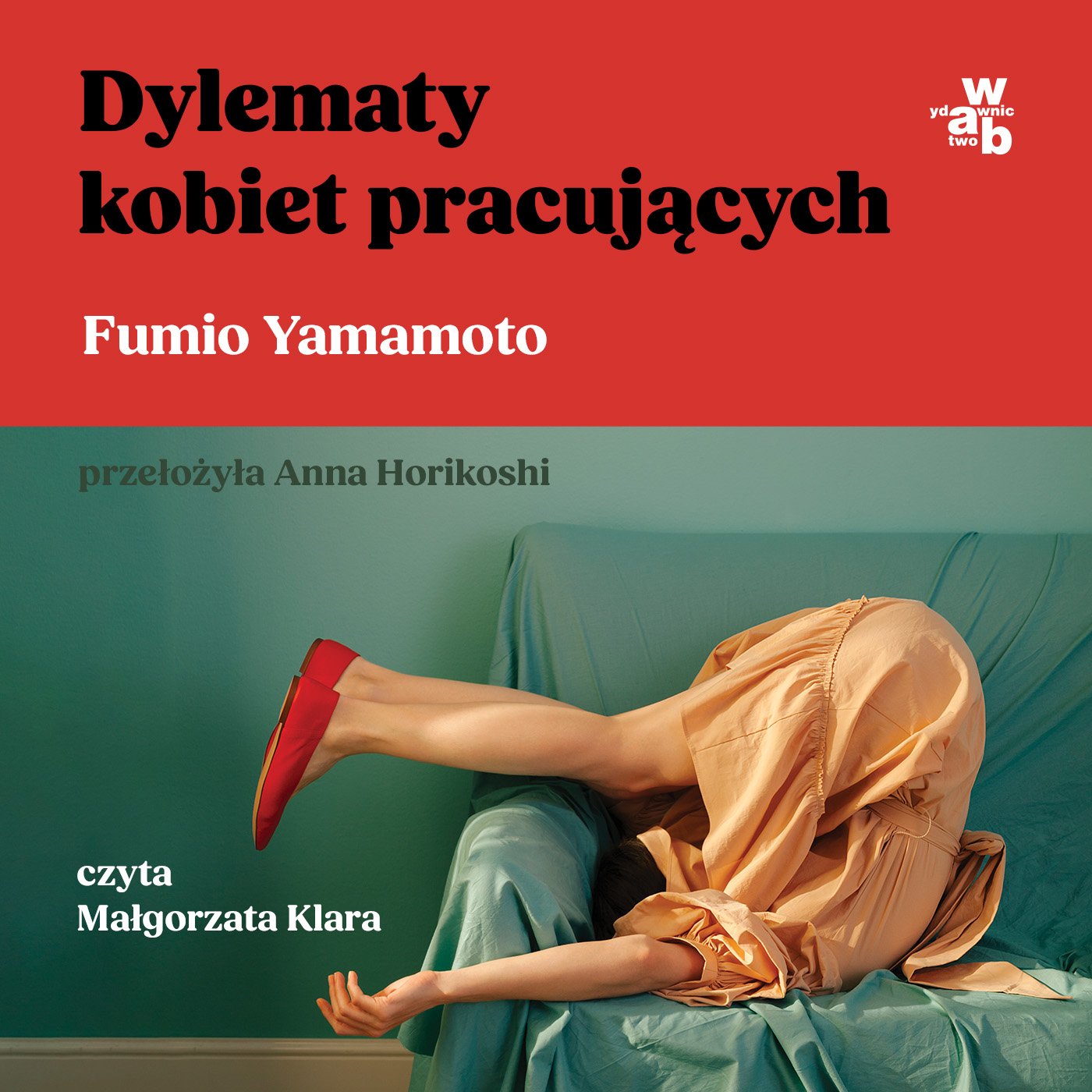 Okładka książki podzielona jest na dwie kolorystyczne części. Górna jest w całości czerwona - widnieje na niej tytuł zapisany dużym, czarnym fontem. Dolna część okładki to fotografia o pastelowej, spokojnej kolorystyce. Na tle jasno turkusowej ściany stoi sofa w podobnym odcieniu. Na niej widoczna jest kobieta ubrana w beżową, jedwabistą sukienkę i czerwone buty na obcasie. Postać ułożona jest w nienaturalnej pozie - głowa, która jest schowana w materiale sukienki i tułów leżą na sofie, a nogi wygięte do góry, wystają na zewnątrz. Kompozycja budzi wrażenie absurdu, przytłoczenia lub symbolicznego zapętlenia, wpisując się w tematykę tytułowych dylematów.