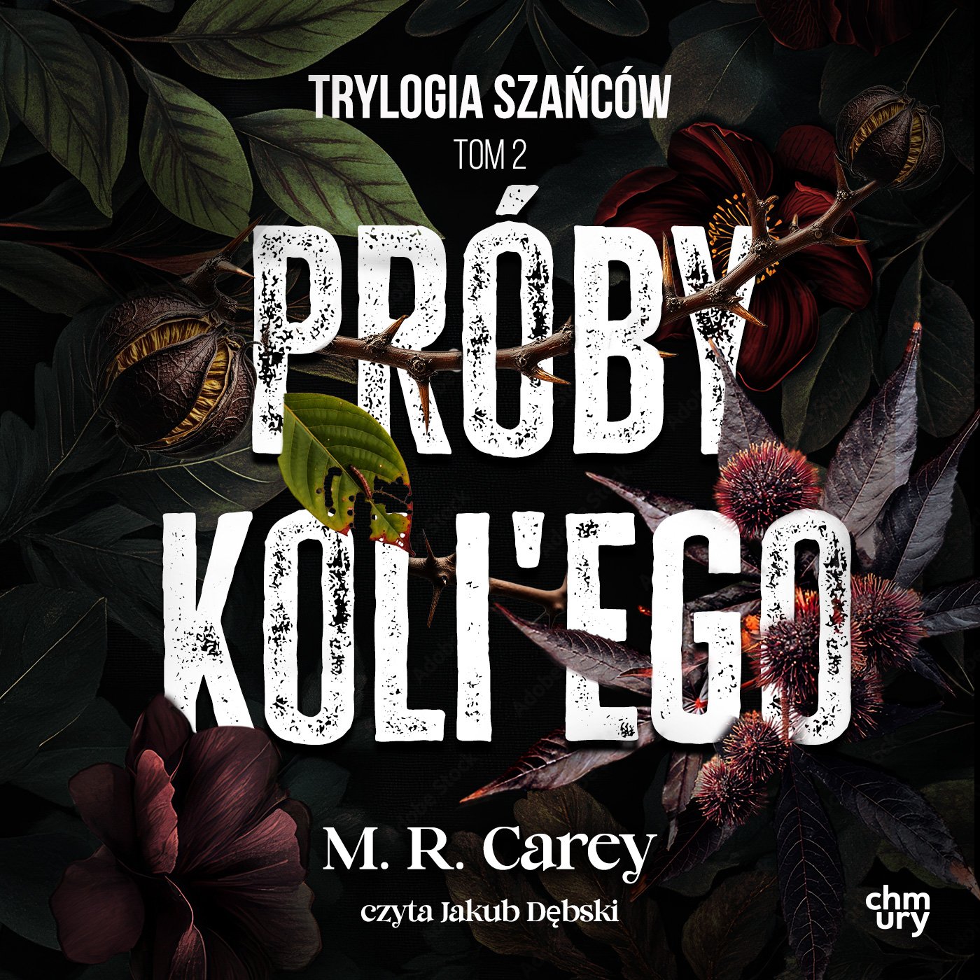 Okładka ma mroczny, tajemniczy charakter. Centralnym elementem jest tytuł zapisany białym kolorem z wyraźną fakturą przypominającą przetarcia. Między literami wychodzą gęste, ciemnozielone liście i kwiaty w odcieniach głębokiej czerwieni, burgundu oraz fioletu, co nadaje całości atmosferę niepokoju i dzikości. Wśród roślin widoczne są kolce i ciernie, podkreślające motyw zagrożenia i trudności.
