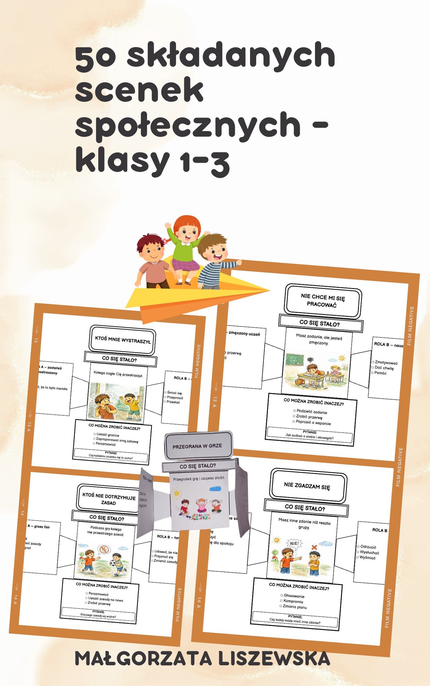 Co to jest? Zestaw 50 interaktywnych scenek do druku i składania. Dzieci otwierają, rozkładają i odkrywają sytuacje krok po kroku. Dla kogo? Klasy 1–3 szkoły podstawowej (TUS, rewalidacja, zajęcia wychowawcze, terapia) Dlaczego działa? - bez ocen i moralizowania - role zamiast zwierzeń - angażuje ręce, wzrok i emocje Co zawiera? - 50 różnych scenek z życia klasy - konflikty, emocje, granice, współpraca - format z klapkami i sekcjami ról Efekt: Dzieci uczą się reagować na trudne sytuacje bez wstydu i presji. Scenki, które się składa – i które naprawdę działają.
