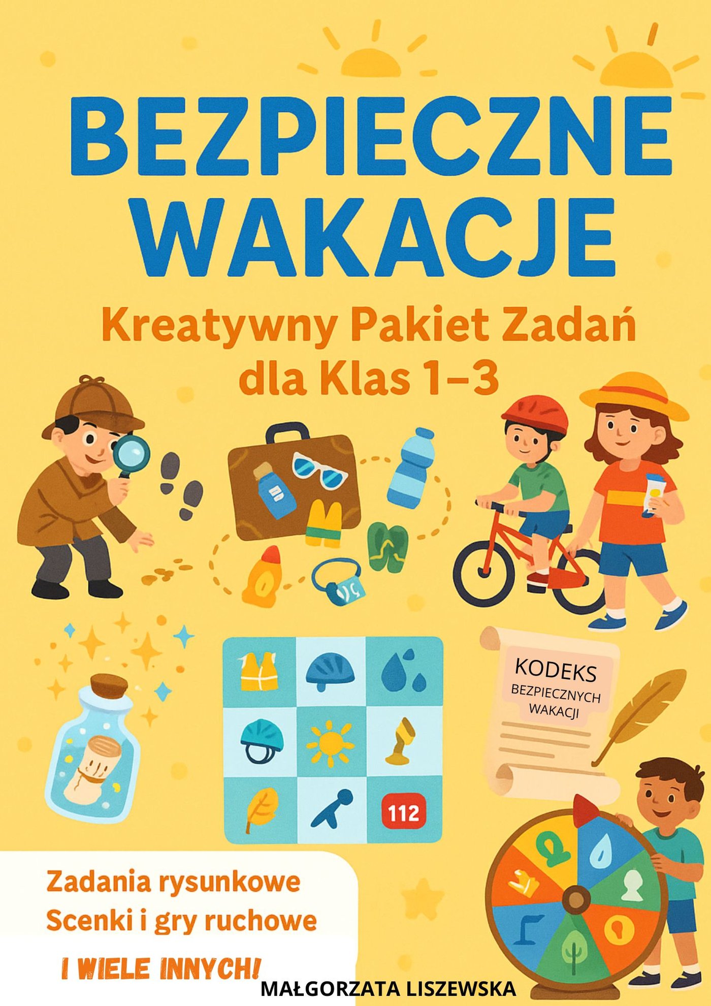 Edukacja + zabawa = bezpieczeństwo przez całe lato! Ten unikalny zestaw 40 stron kreatywnych kart pracy, zabaw, gier i scenek dramowych, które uczą dzieci zasad bezpiecznego wypoczynku w formie przyjemnej i angażującej. Quizy, testy "prawda/fałsz", Scenki do odegrania z zaklęciami bezpieczeństwa, Zabawy ruchowe i dramatyczne – „STOP czy JEDŹ?”, „Wakacyjne światła”, Dziennik wakacyjny do wypełnienia, rymowanki, Kodeks Bezpiecznych Wakacji ,Kalambury i wiele innych! Idealny na ostatnie tygodnie szkoły, półkolonie, świetlicę i zajęcia TUS. Dlaczego warto? Rozwijasz u dzieci: odpowiedzialność, świadomość zagrożeń i umiejętność reagowania. Pobudzasz wyobraźnię i kreatywność – zadania są kolorowe, tematyczne i przystosowane do wieku. Zestaw gotowy do druku – nie wymaga dodatkowego przygotowania. Format: PDF, wersje czarno-białe i kolorowe Dla kogo? Nauczyciele, wychowawcy, terapeuci, rodzice Idealny materiał na koniec roku szkolnego i start wakacyjnych aktywności.