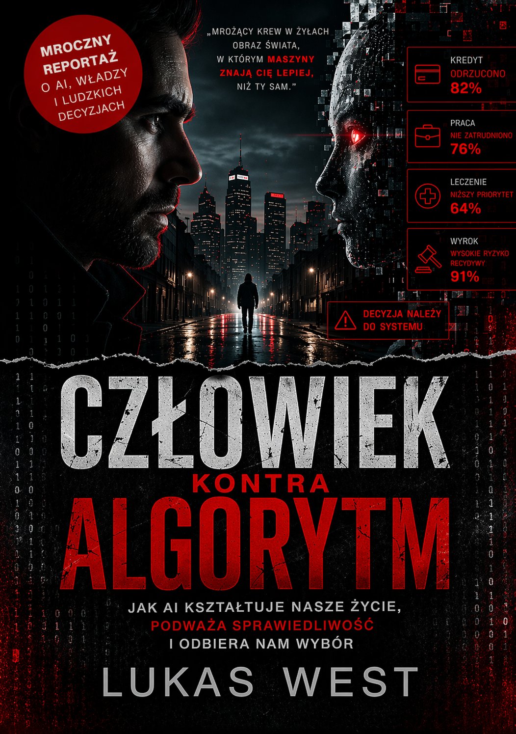 A gdyby o Twoim zdrowiu, pracy, kredycie i wolności decydował system, którego nikt nie potrafi Ci wyjaśnić? „Człowiek kontra algorytm” to mroczny reportaż literacki o świecie, w którym sztuczna inteligencja miała pomagać ludziom, a coraz częściej zaczyna ich oceniać, sortować i odrzucać. Szpitale, sądy, banki, urzędy i działy HR — wszędzie tam algorytmy obiecują obiektywność, szybkość i sprawiedliwość. Ale co, jeśli za chłodnym wynikiem kryją się błędne dane, uprzedzenia i decyzje bez twarzy? To książka o realnej władzy maszyn nad codziennym życiem. O pacjencie, który staje się „ryzykiem”. O kandydacie odrzuconym przez model. O kliencie, który musi udowodnić systemowi, że jest sobą. O obywatelu, którego przyszłość zamienia się w punktację. Nie science fiction. Nie odległa przyszłość. To dzieje się już teraz. I właśnie dlatego ta książka niepokoi bardziej niż thriller.