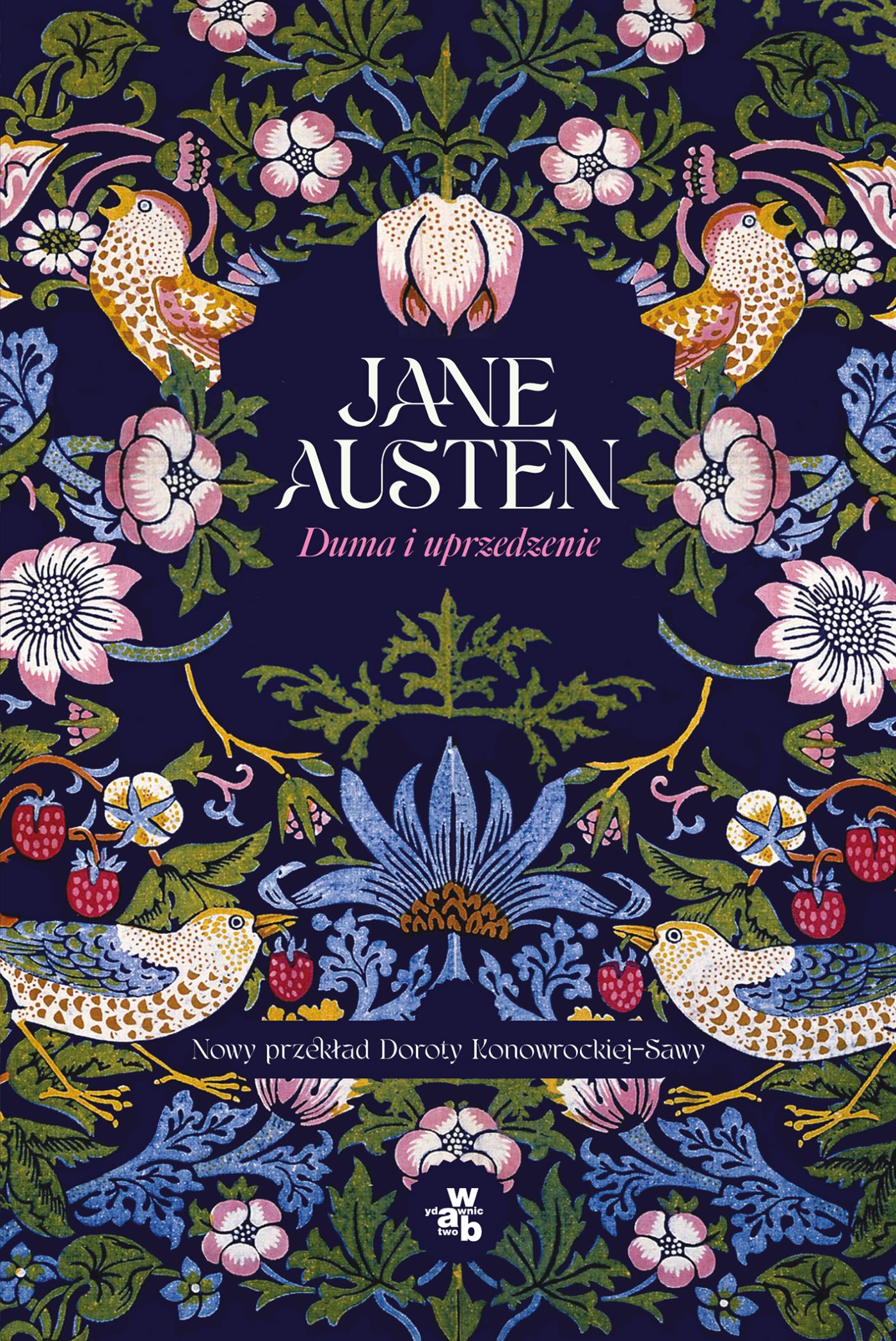Na ciemnogranatowym tle znajduje się bogaty, symetryczny ornament roślinny w stylu folkowym: kolorowe kwiaty, liście, owoce oraz ptaki. W centralnej części umieszczono białe nazwisko autorki „Jane Austen”, a pod nim tytuł „Duma i uprzedzenie” w kolorze różowym. Na dole widnieje informacja o nowym przekładzie Doroty Konowrockiej - Sawy. Całość utrzymana jest w dekoracyjnym, eleganckim stylu.