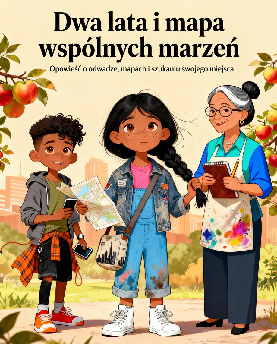 Pociąg syczy na odrapanym peronie. Trampki Liny szurają po polnych kwiatach między szynami. Jej wzrok przelatuje od złota sadu do lśniącego, czekającego pociągu. Przyciskając mapę miejskiej panoramy do piersi, wsiada – jedną nogą w dwóch światach. Przez okno sad maleje, a marzenia rosną.
