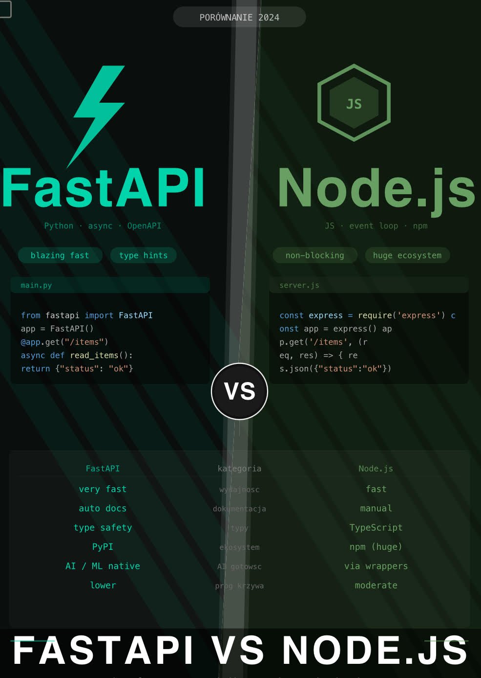 Współczesny backend oferuje wiele technologii – od klasycznych języków po nowoczesne frameworki. Dwa szczególnie popularne rozwiązania to FastAPI (Python) i Node.js z frameworkiem Express. Oba pozwalają na szybkie tworzenie wydajnych API, ale mają różne podejścia, filozofie i obszary zastosowań. FastAPI powstało, aby łączyć szybkość rozwoju (dzięki Pythonowi) z wydajnością zbliżoną do Node.js. Oferuje automatyczną dokumentację, walidację danych i wsparcie dla asynchroniczności.