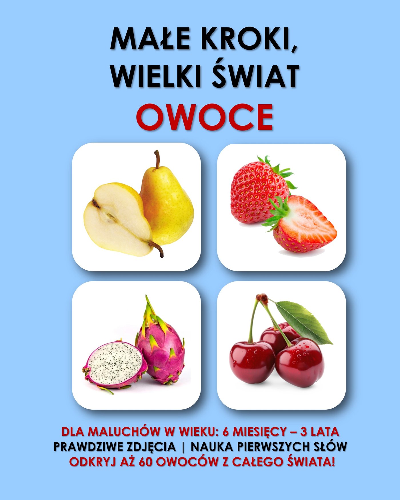 Kolorowe, słodkie i soczyste – aż 60 owoców do poznania, pokazania i nazwania! Od truskawki po smoczy owoc – ta książeczka to prawdziwa uczta dla wzroku i języka. - Aż 60 owoców w realistycznych zdjęciach - Rozwijanie mowy, ciekawości i apetytu - Idealna do pierwszych rozmów przy stole - Dla dzieci od 6 miesięcy do 4 lat Z tą książką Twoje dziecko szybciej powie „banan” niż „bajka”!