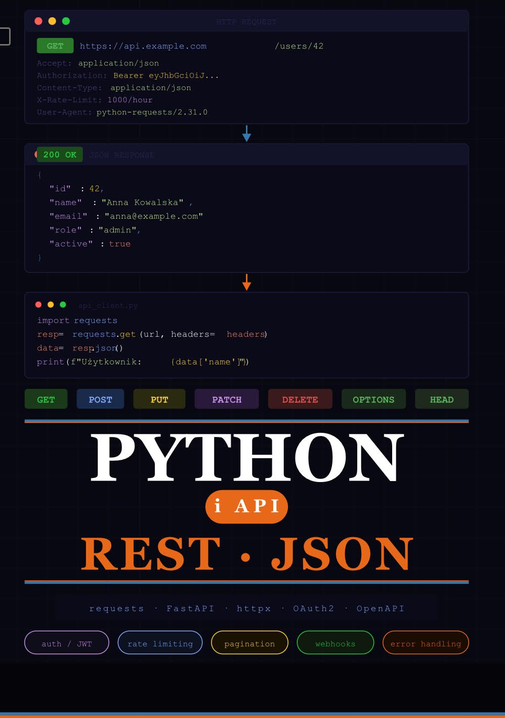Dlaczego Python jest idealny do API? Python ma prostą składnię i bibliotekę requests, która w 3 liniach kodu potrafi połączyć się z dowolnym API na świecie. Nie musisz wiedzieć, jak działa sieć – wystarczy, że znasz adres (URL) i wiesz, jakie dane wysłać. W tym e-booku nauczysz się od podstaw: · wysyłać zapytania do zewnętrznych API, · odbierać i przetwarzać dane (w formacie JSON), · uwierzytelniać się przy użyciu kluczy, · tworzyć własne proste API. Nie potrzebujesz zaawansowanej wiedzy – wystarczy podstawowa znajomość Pythona (zmienne, funkcje, listy, słowniki).