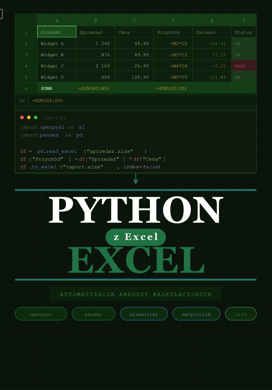Excel jest wszędzie. Raporty sprzedażowe, budżety, analizy, listy klientów – prawdopodobnie codziennie otwierasz plik .xlsx. I prawdopodobnie codziennie wykonujesz te same żmudne czynności: sortowanie, filtrowanie, kopiowanie formuł, generowanie tych samych zestawień. Python zmienia tę grę. Zamiast klikania, piszesz skrypt. Raz napisany kod możesz uruchamiać wielokrotnie, na różnych plikach, o różnych porach dnia. To nie tylko oszczędność czasu – to eliminacja błędów, które zawsze wkradają się przy ręcznej pracy. W tym e-booku nauczysz się: · czytać i zapisywać pliki Excel z poziomu Pythona, · automatyzować czyszczenie i transformację danych, · tworzyć profesjonalnie sformatowane raporty, · łączyć wiele plików w jeden, · generować wykresy i podsumowania.