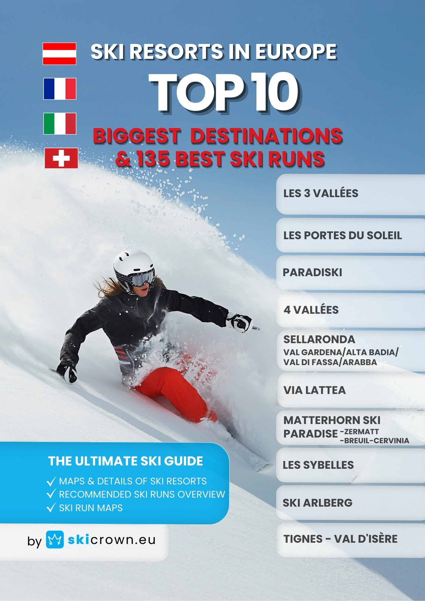 Welcome to the Top 10 Biggest Ski Resorts in Europe: Les 3 Vallées (FR), Les Portes du Soleil (FR+CH), Paradiski (FR), 4 Vallées (CH), Sellaronda (IT), Via Lattea (IT+FR), Matterhorn Ski Paradise (CH+IT), Les Sybelles (FR), Ski Arlberg (AT), Tignes-Val d'Isère (FR) In this eBook, we’ve compiled everything you need to plan an unforgettable skiing adventure on the slopes of Europe. Here, you'll find: - Detailed descriptions and parameters of the resorts, complete with maps; - Specifications of the top ski runs; - Ski run maps. We have skied in more than 100 ski resorts across Europe. Our collected experiences, along with our own photos and videos, were used to create this guide.