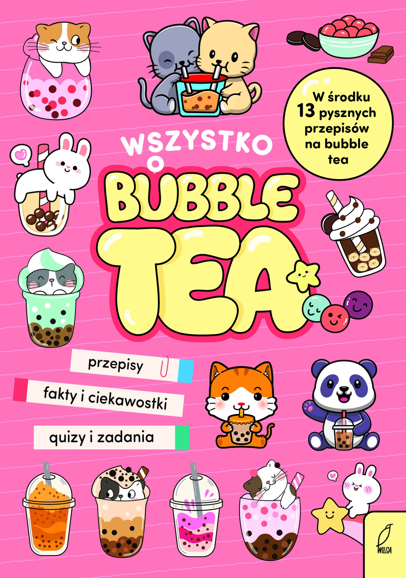 Okładka ebooka przedstawia ilustracje kubków bubble tea oraz uroczych zwierzątek pijących napój. Na okładce znajdują się informacje o zawartości: przepisy, fakty i ciekawostki oraz quizy i zadania.