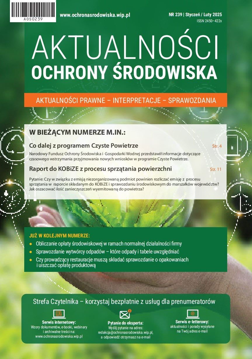 Od 2025 roku obowiązują stawki zawarte w obwieszczeniu ministra klimatu i środowiska z 13 sierpnia 2024 r. w sprawie wysokości stawek kar za przekroczenie dopuszczalnego poziomu hałasu na rok 2025. Co ono zmienia? Zajrzyj na str. 4. Czy w związku z emisją niezorganizowaną, podmiot, powinien rozliczać emisję z procesu sprzątania w raporcie składanym do KOBiZE i sprawozdaniu środowiskowym do marszałków województw? Odpowiedź znajdziesz na str. 11. Rozporządzenie z 13 czerwca 2024 r. w sprawie ustanowienia ram środków na rzecz wzmocnienia europejskiego ekosystemu produkcji technologii neutralnych emisyjnie stanowi jeden z aktów wprowadzających określone regulacje w obszarze zrównoważonych zamówień publicznych. Czego dotyczą te regulacje? Dowiesz się z tekstu na str. 12.