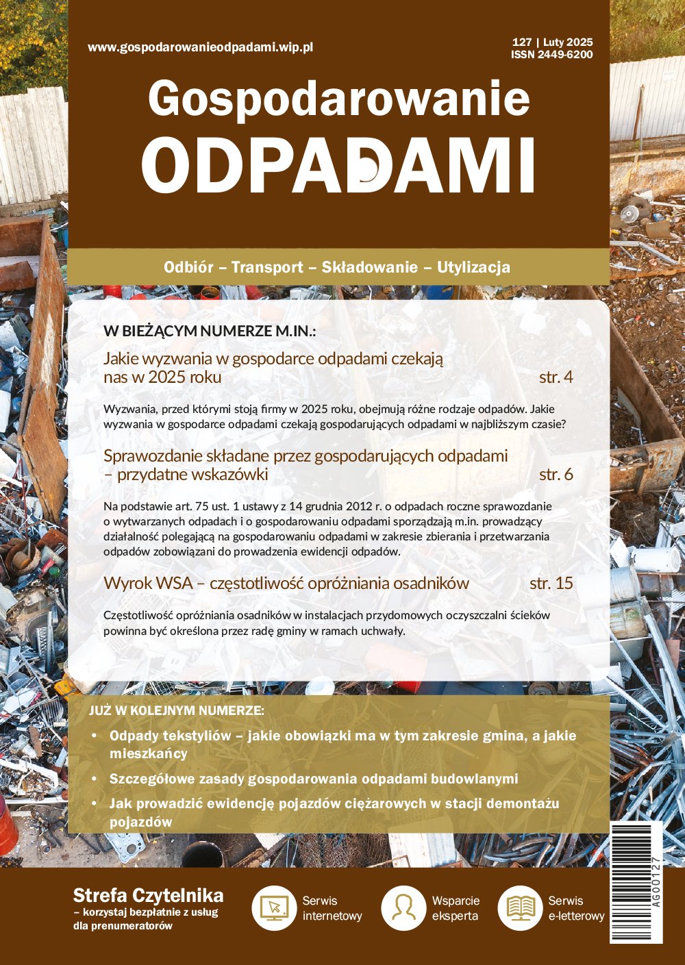 W nowy rok wchodzimy ze sporą dawką ciekawych artykułów dotyczących gospodarki odpadami. O czym przeczytasz w najnowszym numerze? Wyzwania, przed którymi staną firmy w 2025 roku, obejmują różne rodzaje odpadów. Jakie wyzwania w gospodarce odpadami czekają gospodarujących odpadami w najbliższym czasie? Dowiesz się dzięki lek turze tekstu na str. 4. Na podstawie art. 75 ust. 1 ustawy z 14 grudnia 2012 r. o odpadach roczne sprawozdanie o wytwarzanych odpadach i o gospodarowaniu odpadami sporządzają m.in. prowadzący działalność polegającą na gospodarowaniu odpadami w zakresie zbierania i przetwarzania odpadów zobowiązani do prowadzenia ewidencji odpadów. Jeśli interesują Cię przydatne wskazówki o tych sprawozdaniach, zajrzyj na str. 6. W przypadku opłaty środowiskowej za składowanie odpadów jej wysokość jest uzależniona od rodzaju i ilości składowanych odpadów, a w przypadku opłat podwyższonych, również od czasu składowania odpadów. Jak wyliczyć opłatę dla składowiska odpadów, dowiesz się z artykułu na str. 10.