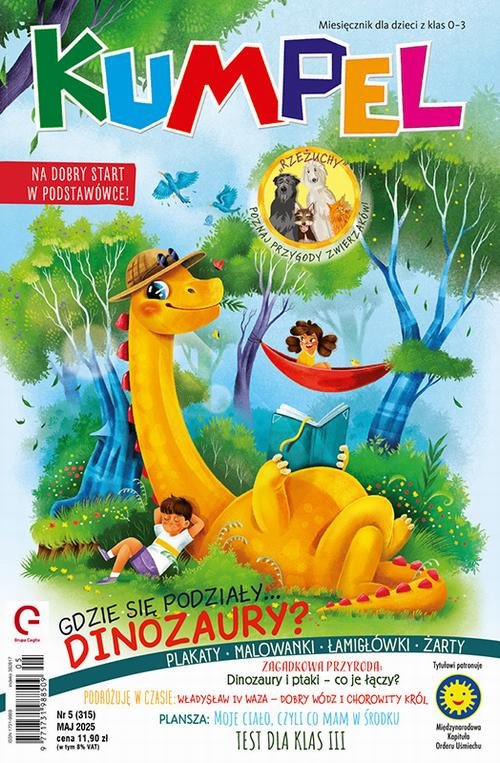 Czy wiecie, że dinozaury, a w zasadzie ich dalecy krewniacy są wokół nas?! Kim są? Jak wyglądają? Sprawdzimy. Będą też łamigłówki z dinozaurami w roli głównej i powiedzonka z nimi związane. A w wierszu opowiemy o pewnym dinozaurze, co szukał przyjaciół. Nasze plansze pod tytułem „Moje ciało” pozwolą Wam sprawdzić, co macie w środku.J Tym razem o kościach, kostkach i stawach, czyli o szkielecie. Będzie ciekawie! Specjalnie na majówkę więcej żartów. Pośmiejemy się z rozgadanymi zwierzakami. Do tego kolorowanka, wpisowniczek i wycinanka. Mamy też dla Was specjalne zadanie! Zajrzyjcie na s. 7 i opowiedzcie nam o swoim zwierzaku. Już nie możemy się doczekać Waszych opowieści.